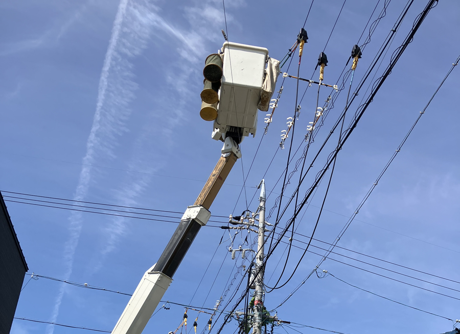 各家庭へ引っ張られている電柱の配線を、高所作業車に乗って行う配電線工事をしています。3名~15名のチーム制で作業を行います。災害時、停電の復旧作業も対応しているため社会貢献度が大きな仕事です。分からない事があっても、先輩スタッフがそばについて、イチから仕事を教えますのでご安心ください。資格取得支援制度も設けており、着実にスキルアップできます。