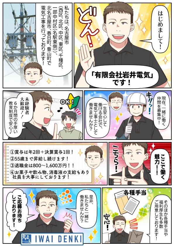 | 勤務エリア | 現場の範囲は名古屋市(西区、北区、中区、東区、千種区)、一部中村区(名駅東側)、北名古屋市、春日町、豊山町 |